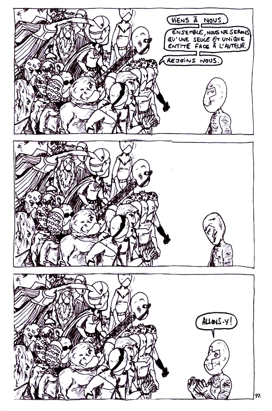 Je suis fier de moi quand je vois les 10 épisodes de Black Red. Fier de voir que je me suis amélioré alors que je n'y croyais pas vraiment moi-même. Maintenant, c'est sûr, avec le temps, dans dix, quinze ans, je saurais dessiner correctement. D'ici là, je continuerais à faire de l'àpeuprécorrekt.Plus que 2 numéros avant la fin. J'hésite à faire quelques épisodes supplémentaires. J'ai envie de passer à autre chose aussi. On verra.